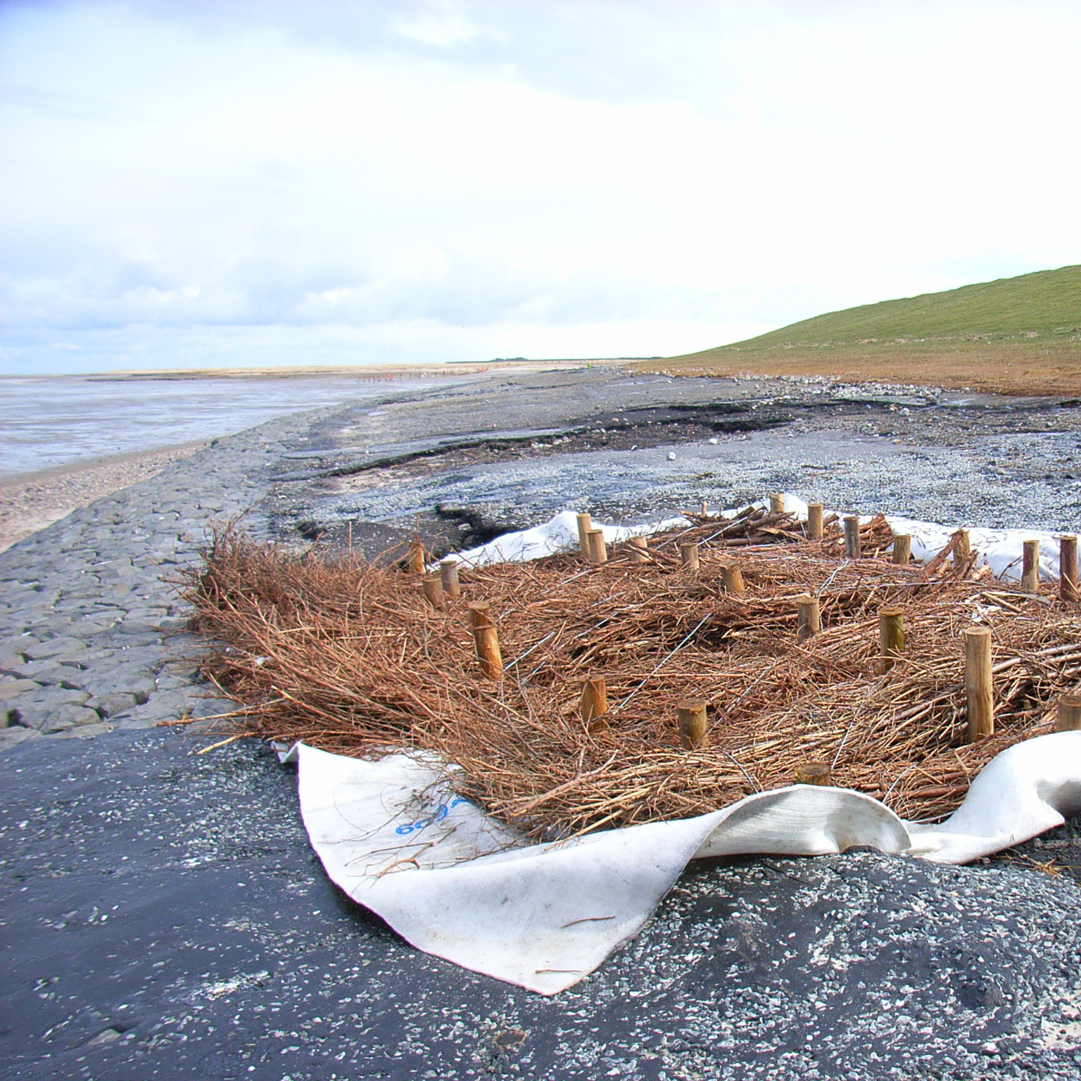 Lahnungen, "Zäune" aus einer Doppelpfahlreihe, zwischen die grobes Gestrüpp gestopft und mit Draht befestigt wird, werden in regelmäßigen Abständen in das Vorland gebaut und mit Querriegeln schließlich in rechteckige Flächen unterteilt. Das führt zur Beruhigung der Wasserbewegung, damit können im Meer vorhandene Sedimente besser absinken.