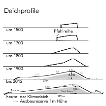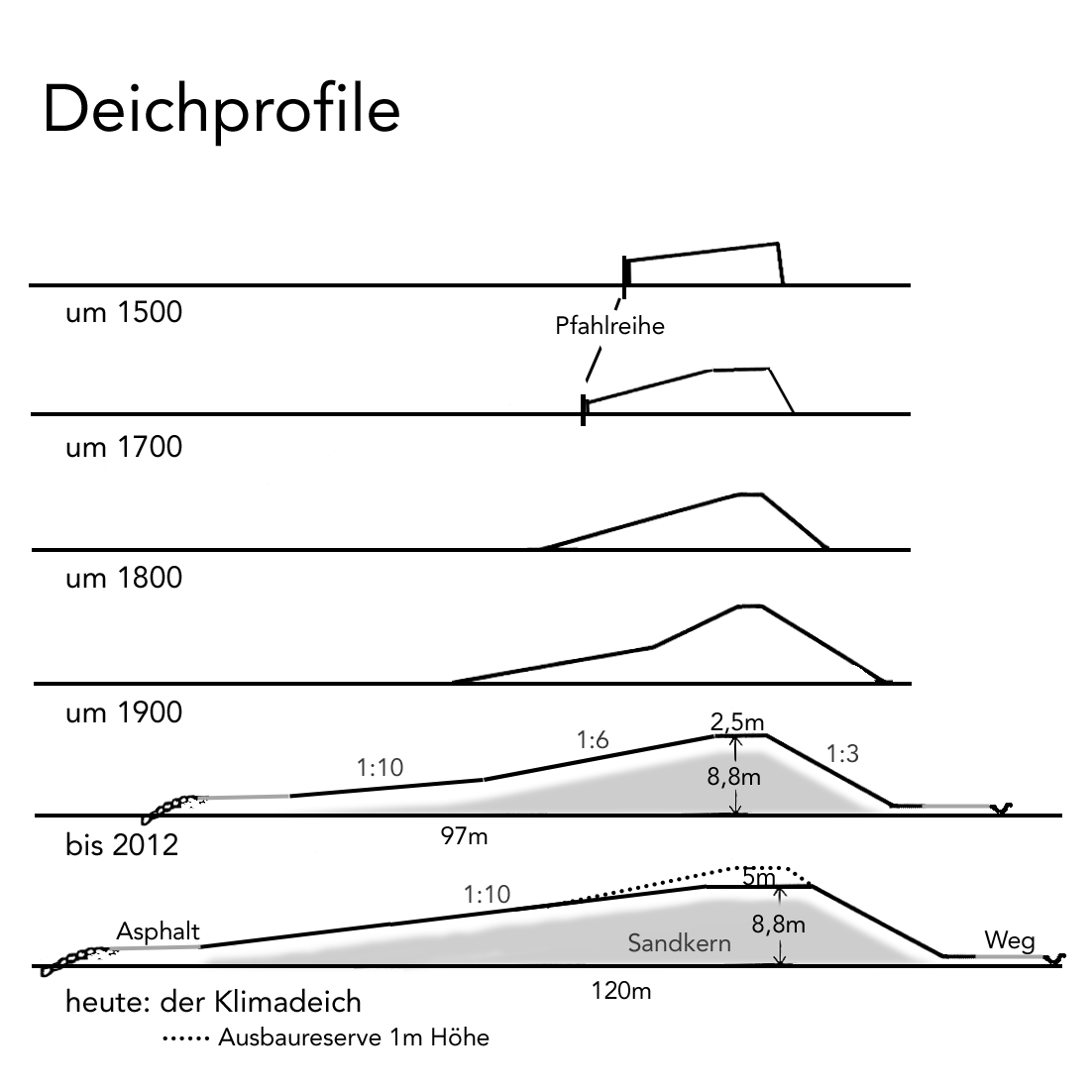 Im Laufe der Jahrhunderte stieg die Höhe der Deiche längst nicht so sehr wie die benötigte Grundfläche - man sah ein, dass man gegen die Wellen weniger einen Wall als einen künstlichen 'Strand' errichten musste, auf dem sich die Wellen totlaufen können.