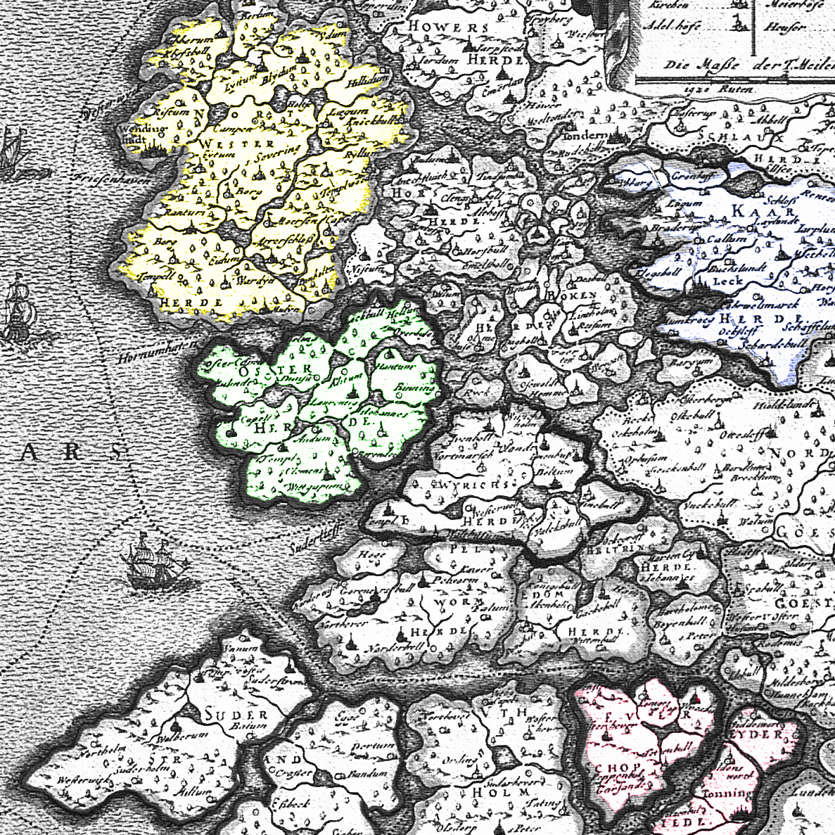 Die Ausschnitte aus den Karten von Meyer (Abb. 1a+b) zeigen den Landverlust ab dem Mittelalter (auch wenn die historische Qualität der Karten durchaus bezweifelt werden darf). Die Siedler mussten offensichtlich großen Landverlust hinnehmen, und der persönliche und wirtschaftliche Verlust lässt sich gar nicht tragisch genug ansetzen. Es erscheint begreiflich, dass alle Möglichkeiten der Landsicherung ausgeschöpft wurden und durch Landgewinnung der 'gefräßigen Nordsee' möglichst viel Land wieder abgetrotzt werden sollte. Eine Vorstellung vermittelt die Wikipedia über die untergegangene Stadt Rungholt.